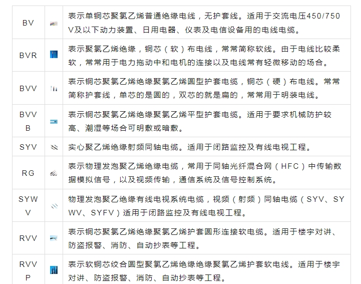 注:B(B)——第一個字母表示布線,第二個字母表示玻璃絲編制。V(V)——第一個字母表示聚乙烯(塑料)絕緣,第二個字母表示聚乙烯護套。L(L)——鋁,無L則表示銅F(F)——復合型R——軟線S——雙絞X——絕緣橡膠
